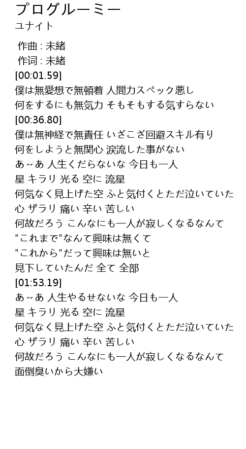 | [01:02.28] | あ~あ 人生くだらないな 今日も一人 |