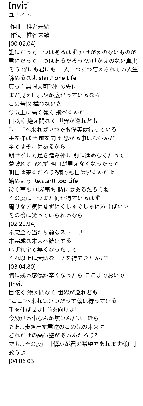 | [00:54.68] | 諦めるなよ start! one Life |