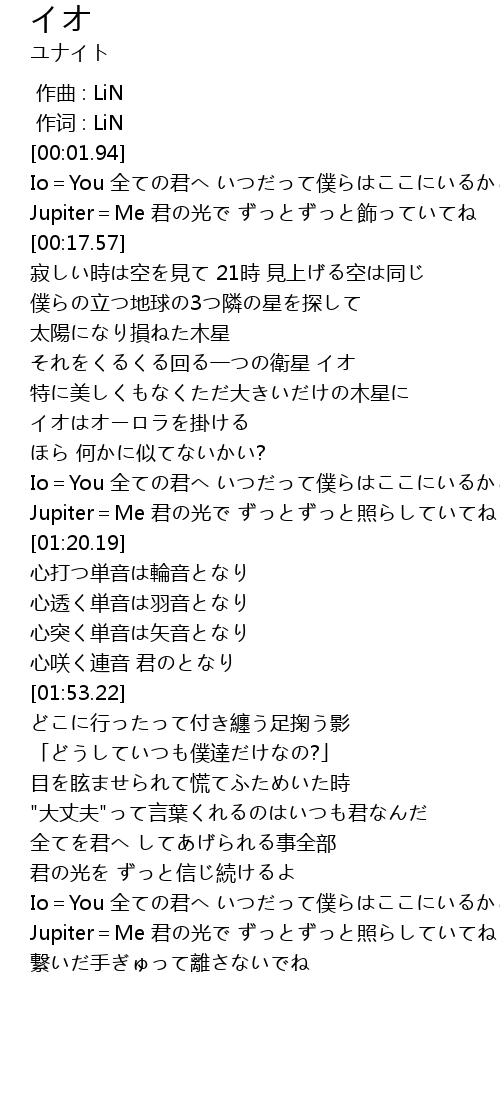 | [00:47.14] | 太陽になり損ねた木星 それをくるくる回る一つの衛星 イオ |