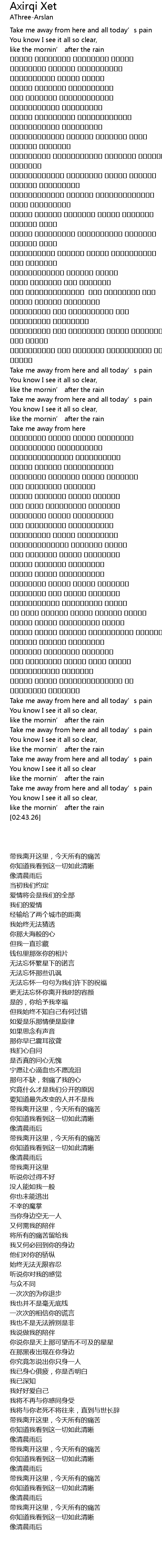 | [01:52.98] | ئۆز دەردىڭنى ئۆزۈڭ تارت مېنىڭ دەرتلىرىمگە يەتكۈچە |