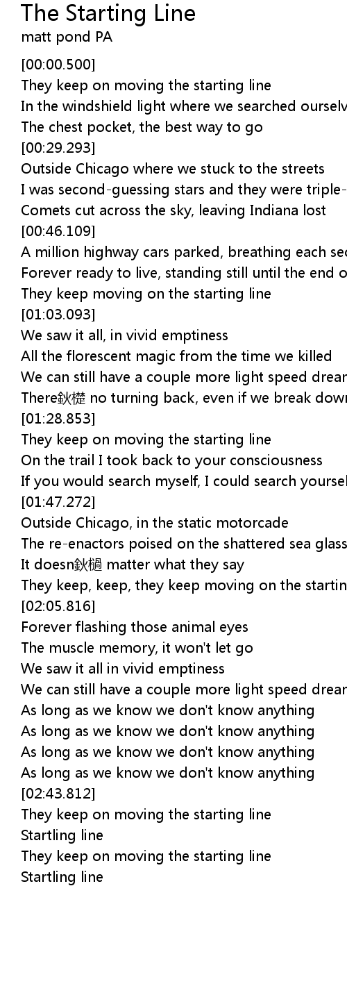 | [02:00.616] | They keep, keep, they keep moving on the starting line |