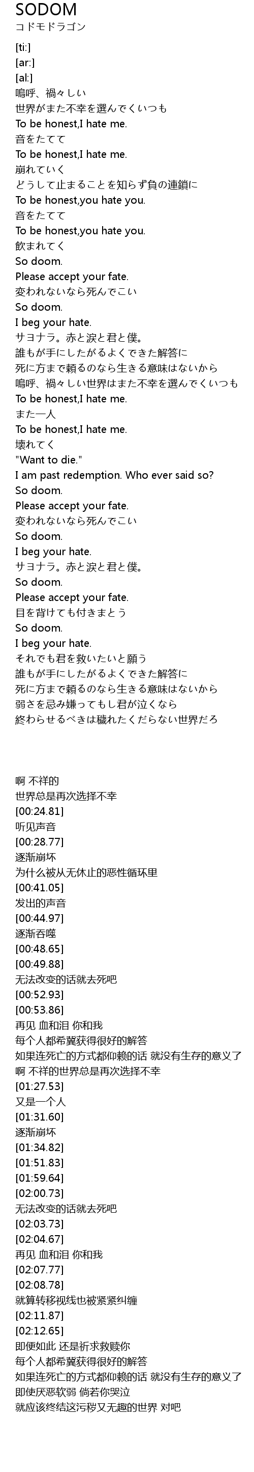| [02:39.62] | 終わらせるべきは穢れたくだらない世界だろ |