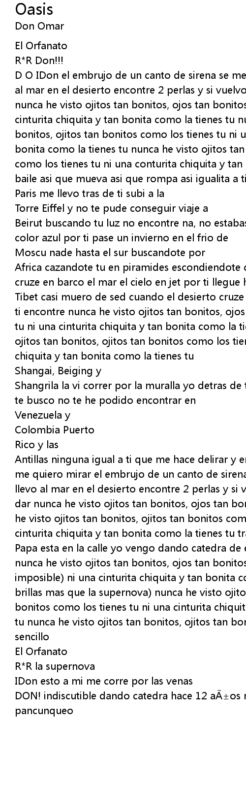 | D O IDon el embrujo de un canto de sirena se me metio por las venas y me llevo al mar en el desierto encontre 2 perlas y si vuelvo a verla se las voy a dar nunca he visto ojitos tan bonitos, ojos tan bonitos como los tienes tu ni una cinturita chiquita y tan bonita como la tienes tu nunca he visto ojitos tan bonitos, ojitos tan bonitos como los tienes tu ni una cinturita chiquita y tan bonita como la tienes tu nunca he visto ojitos tan bonitos, ojitos tan bonitos como los tienes tu ni una conturita chiquita y tan bonita como la tienes tu que baile asi que mueva asi que rompa asi igualita a ti tu perfumito de | |