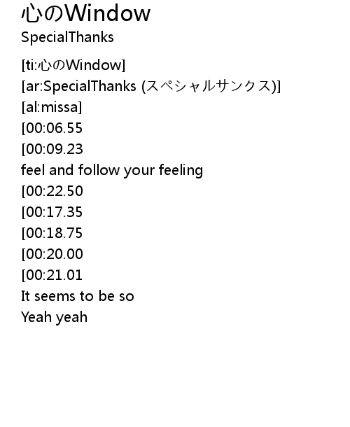 | [00:00.91][00:06.55][00:33.32][00:38.40][00:54.67][00:59.91][01:05.31][01:10.55][01:16.01][01:21.09] | 空けるのは心のwindow |