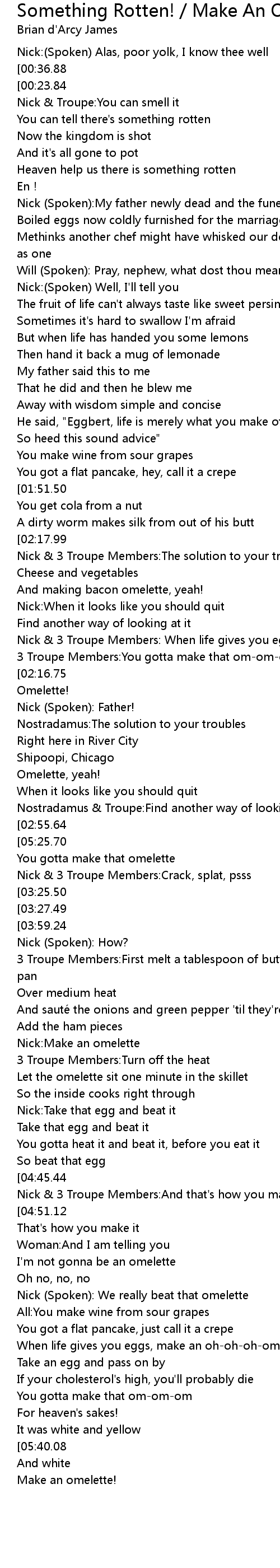 | [04:46.45] | Nick & 3 Troupe Members:And that's how you make an omelette |