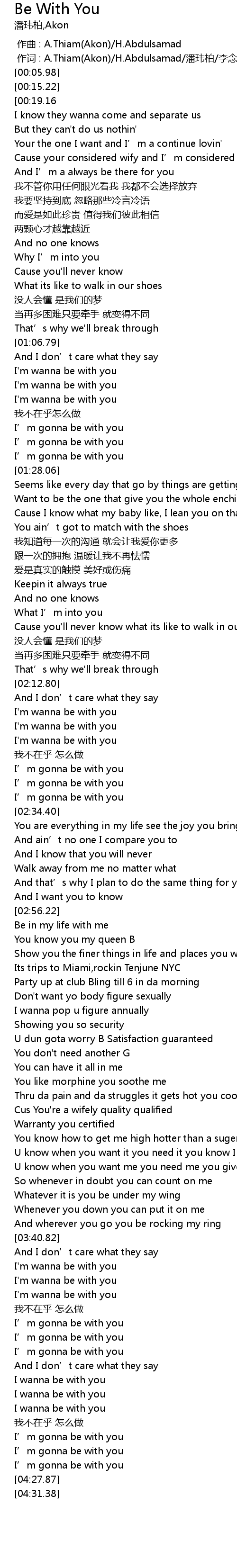 | [00:01.00] | 作词 : A.Thiam(Akon)/H.Abdulsamad/潘玮柏/李念和 |