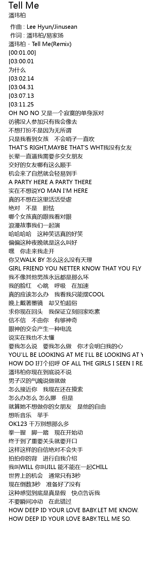 | [00:00.50] | 潘玮柏 - Tell Me(Remix) |