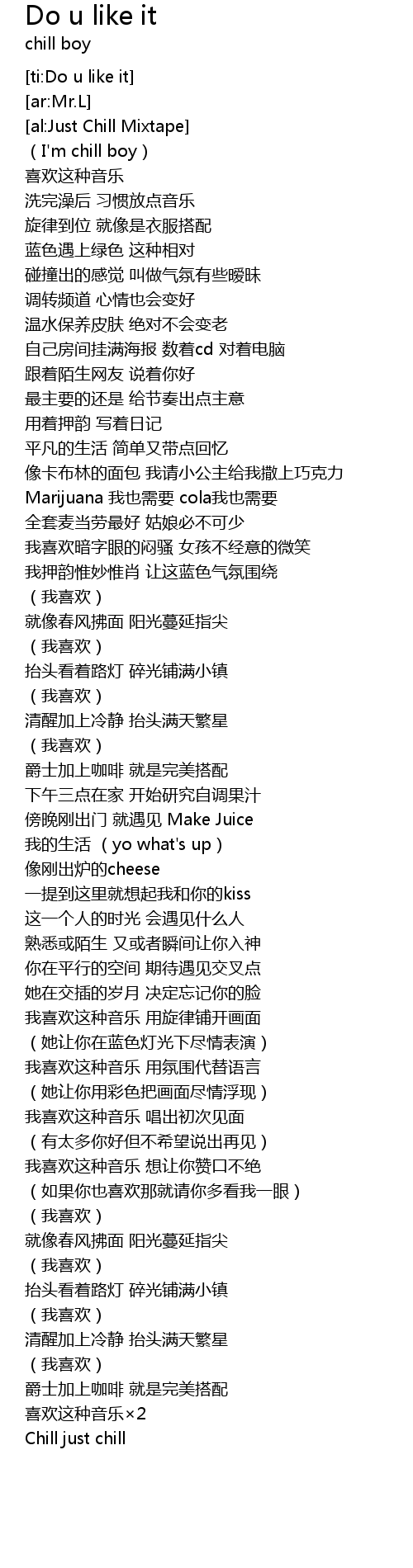 | [01:59.38] | 我喜欢这种音乐 想让你赞口不绝 |
