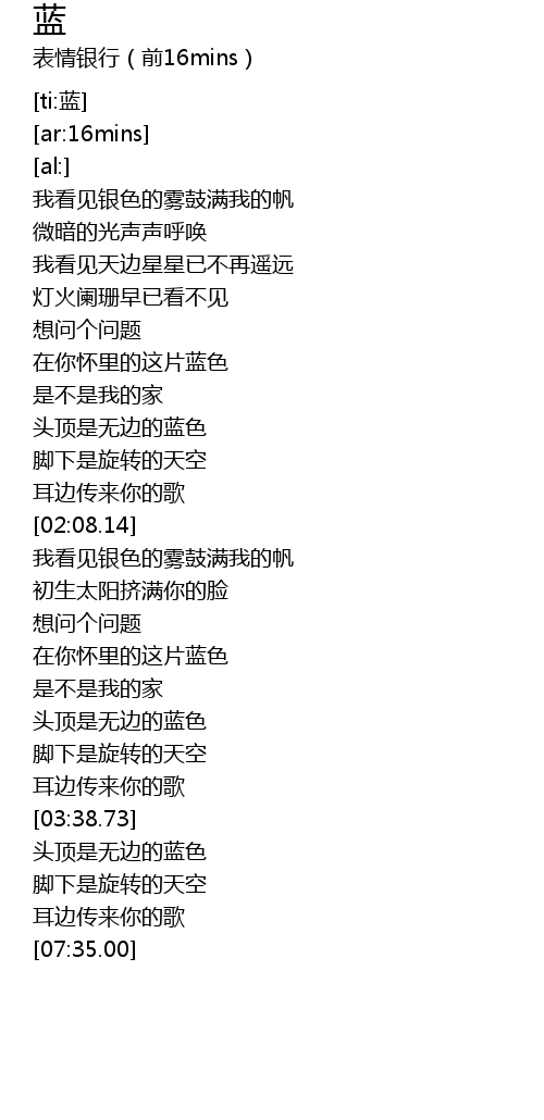 | [07:07.69] | tóu dǐng shì wú biān de lán sè |