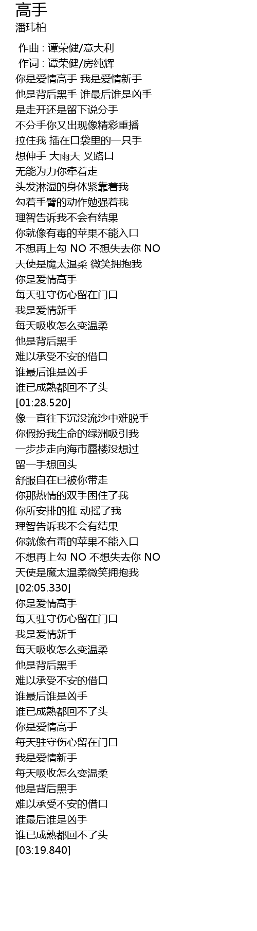 | [00:16.130] | 你是爱情高手 我是爱情新手 |
