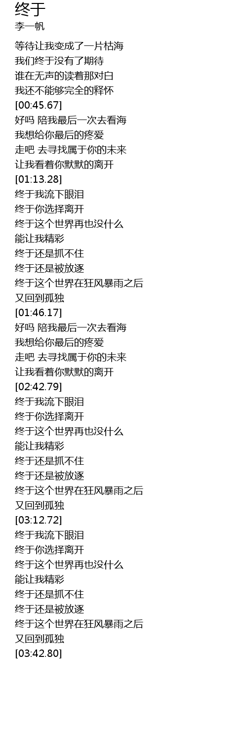 | [00:47.13] | hǎo ma péi wǒ zuì hòu yī cì qù kàn hǎi |