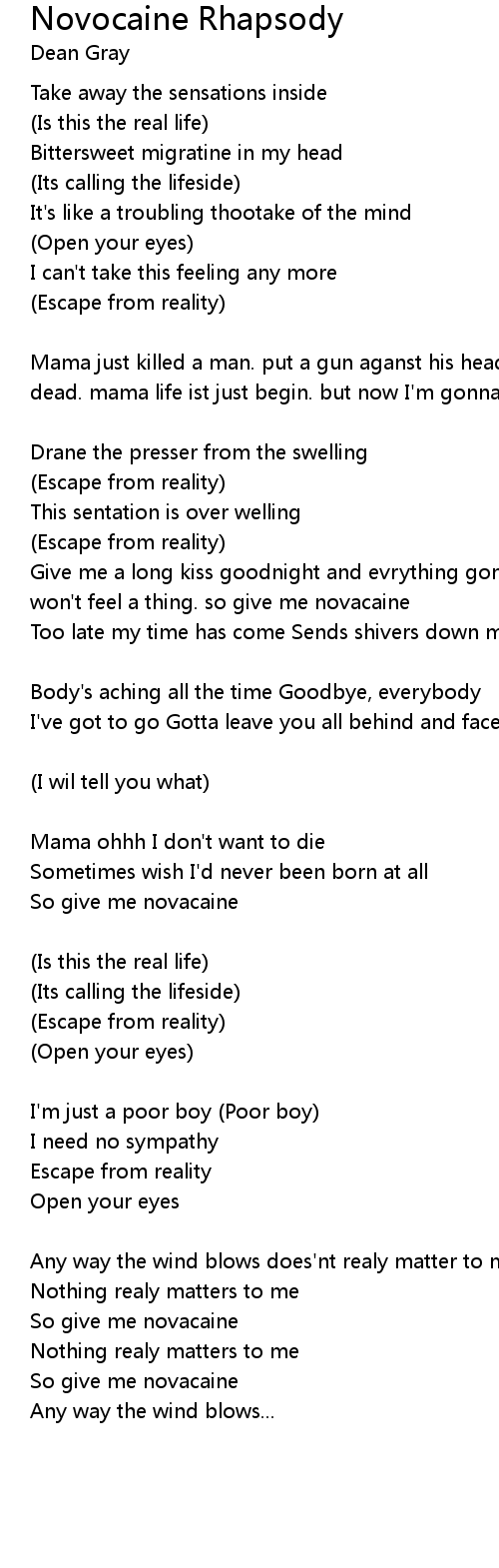 Give me a long kiss goodnight and evrything gonna be allright.tell me that I won't feel a thing. so give me novacaine