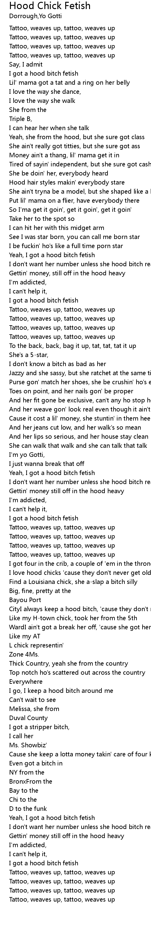 | Yeah, I got a hood bitch fetish | |