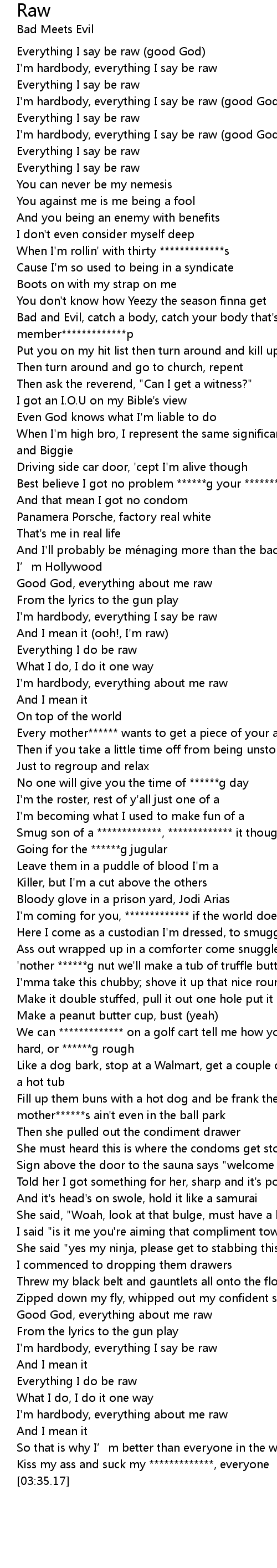 | [00:35.50] | I' m hardbody, everything I say be raw good God |