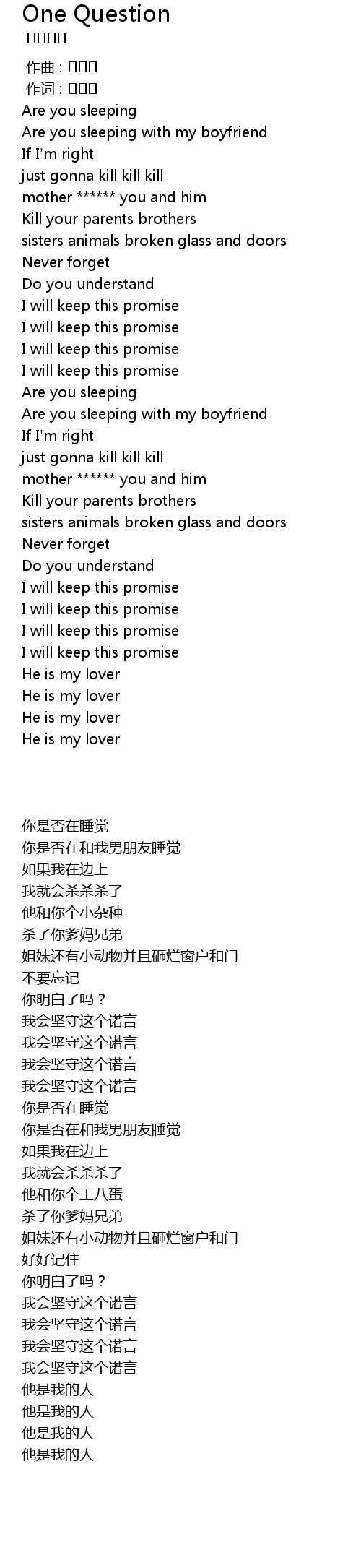| [00:56.45] | mother ****** you and him |