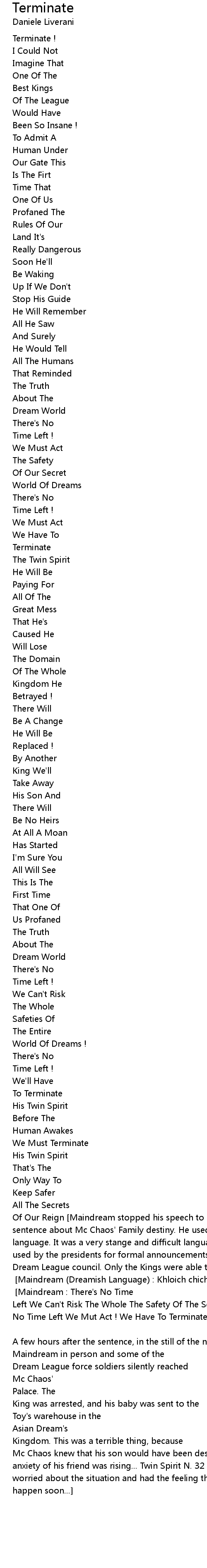 Of Our Reign [Maindream stopped his speech to officialy pronounce the final sentence about Mc Chaos' Family destiny. He used tha ancient "Dreamish" language. It was a very stange and difficult language that was traditionally used by the presidents for formal announcements of important decisions to the Dream League council. Only the Kings were able to understand that ancient language....] [Maindream (Dreamish Language) : Khloich chich chich dout figt thegat fait' aaautret heeroullah iearallwoow !] [Maindream : There's No Time Left We Can't Risk The Whole The Safety Of The Secret World Of Dreams ! There's No Time Left We Mut Act ! We Have To Terminate The Twin Spirit ,Terminate...] [Storyteller]