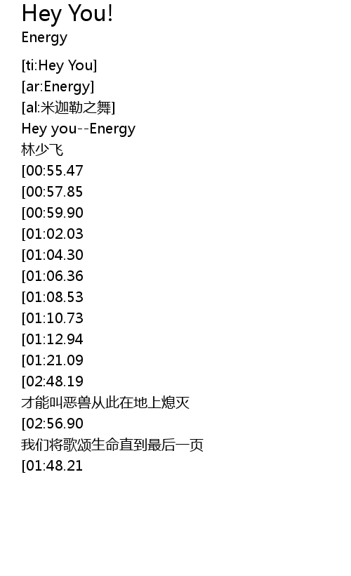 | [03:14.23][02:56.90][01:38.68] | Hey you 画下诗篇 我们将歌颂生命直到最后一页 |