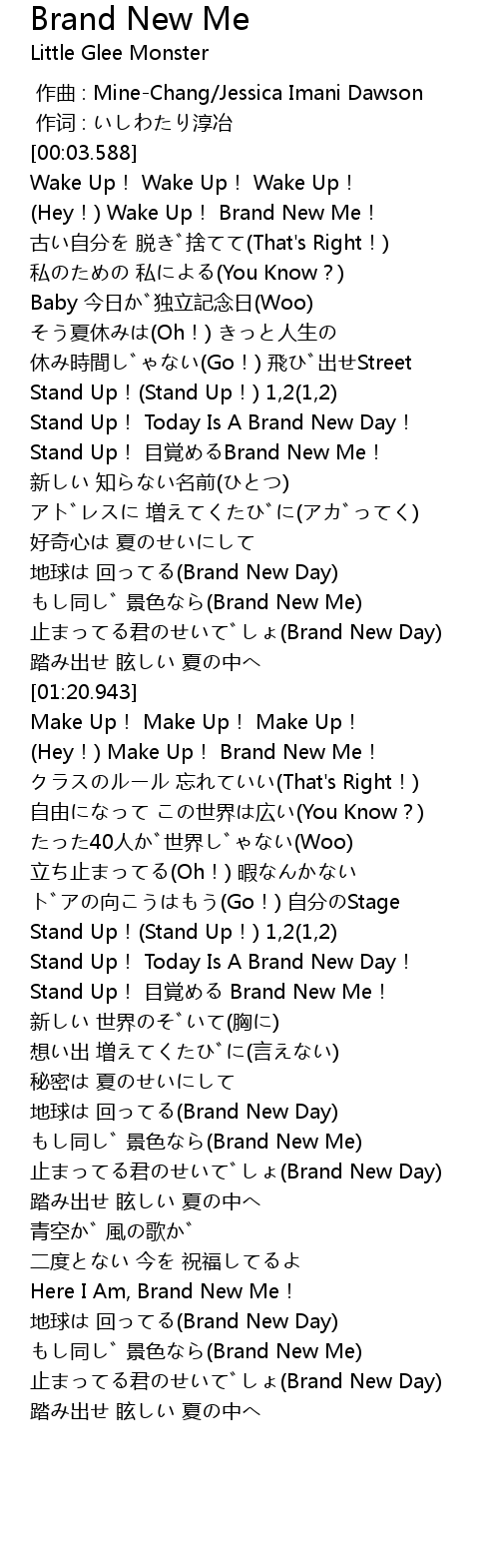 | [02:01.577] | Stand Up! mù jué Brand New Me! |