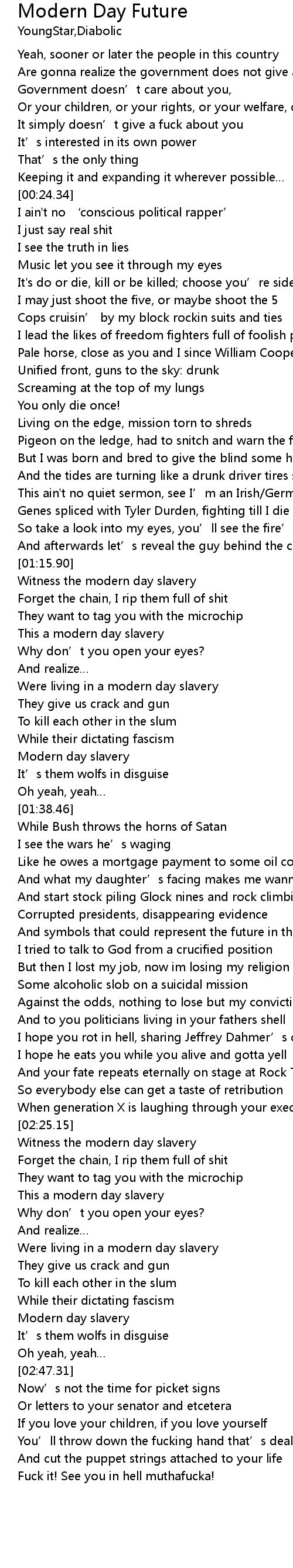 | [01:42.00] | Like he owes a mortgage payment to some oil corporation |