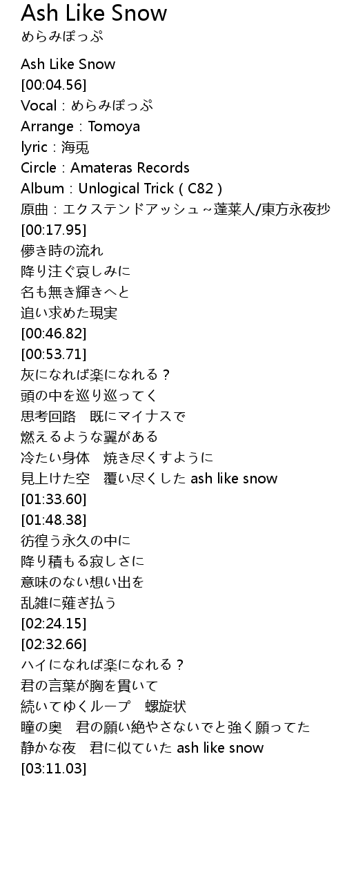 | [03:02.97] | 静かな夜 君に似ていた ash like snow |