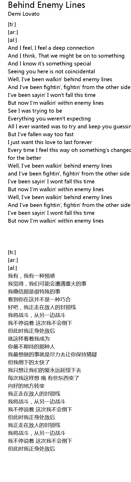 Well, I've been walkin' behind enemy lines |