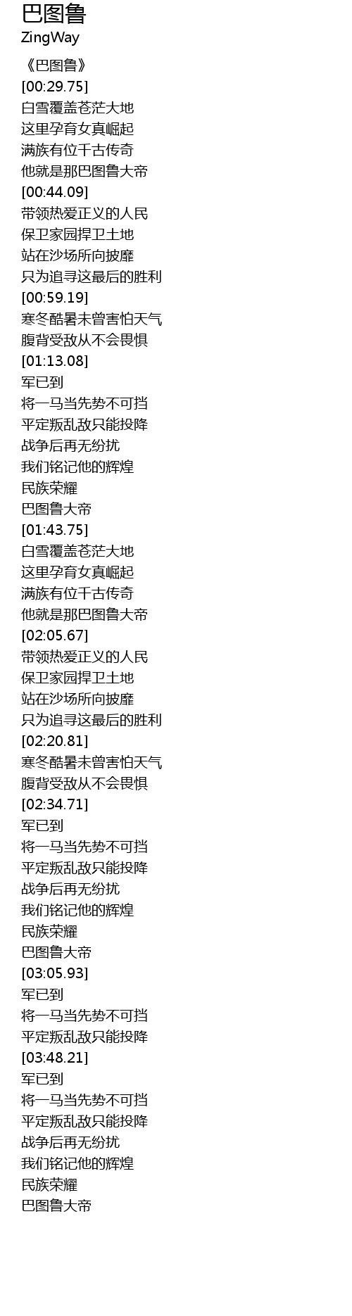 | [00:00.70] | 《巴图鲁》 |