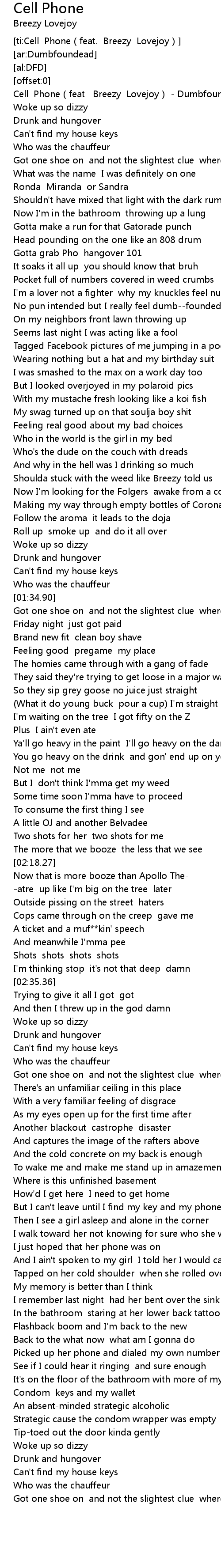 | [00:00.57] | Cell Phone(feat Breezy Lovejoy) - Dumbfoundead |