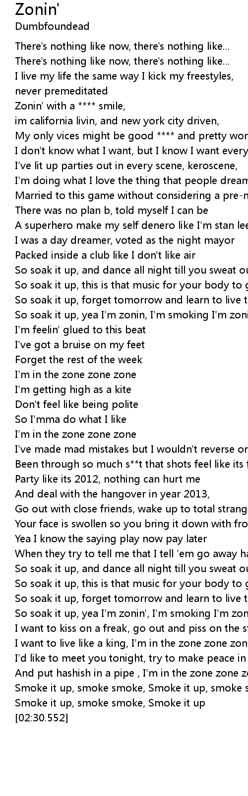 | [01:11.085] | So soak it up, yea I'm zonin, I'm smoking I'm zonin |