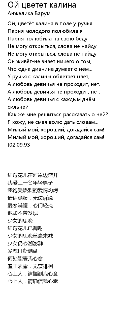 | [00:18.96] | Ой, цветёт калина в поле у ручья. |