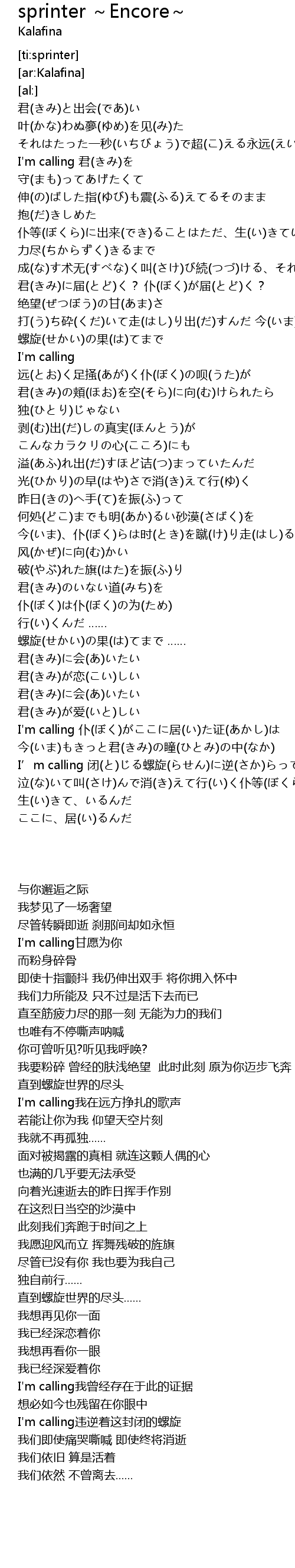 | [01:37.61] | I'm calling 远(とお)く足掻(あが)く仆(ぼく)の呗(うた)が |