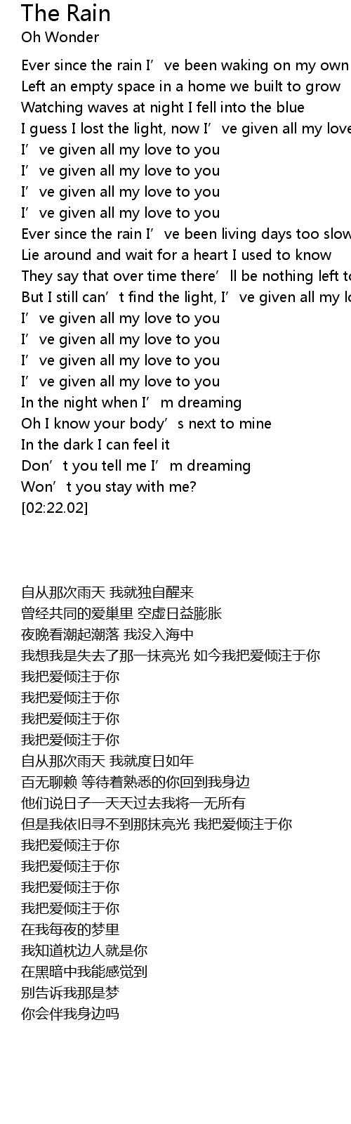 | [00:58.10] | Ever since the rain I' ve been living days too slow |