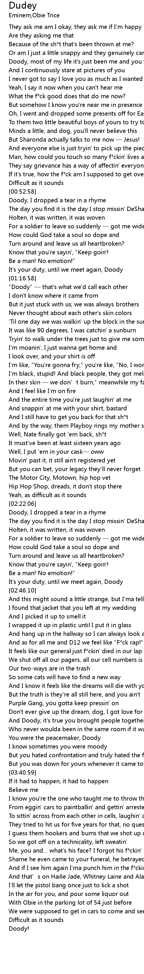 | [00:52.94] | Doody, I dropped a tear in a rhyme |