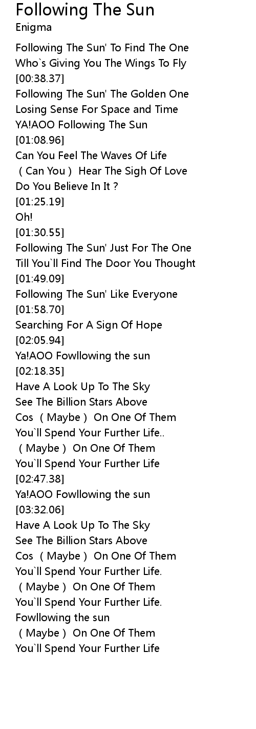 | [02:07.75] | Ya! AOO Fowllowing the sun |