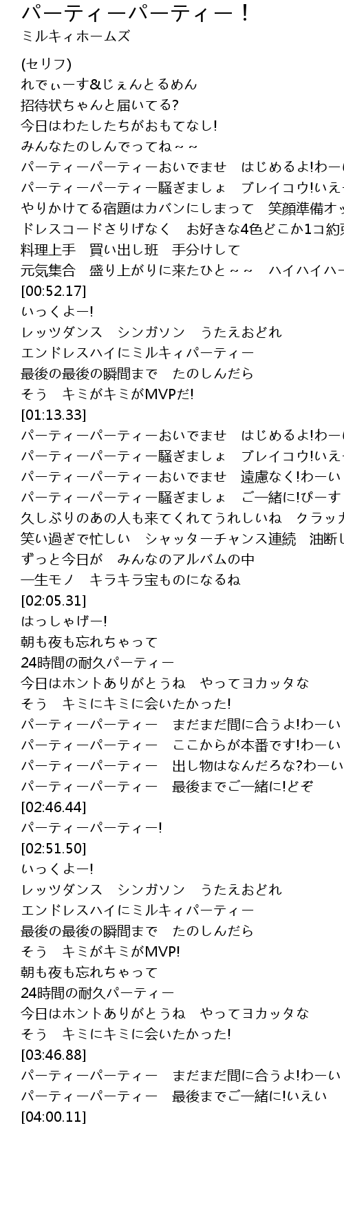 | [01:13.76] | パーティーパーティーおいでませ はじめるよ!わーい |