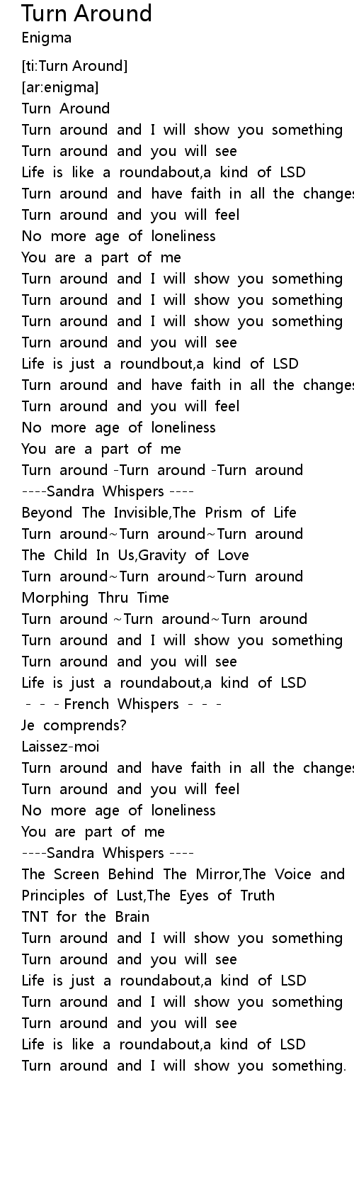 | [01:47.398] | Turn around Turn around Turn around |
