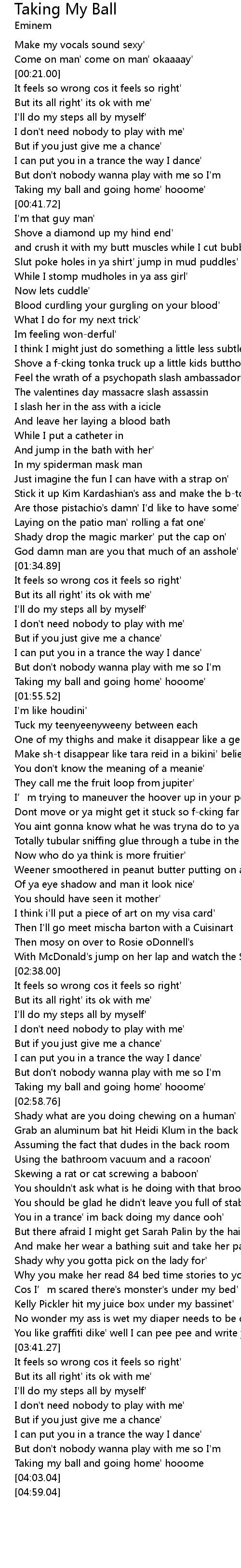 | [00:48.08] | Slut poke holes in ya shirt' jump in mud puddles' |