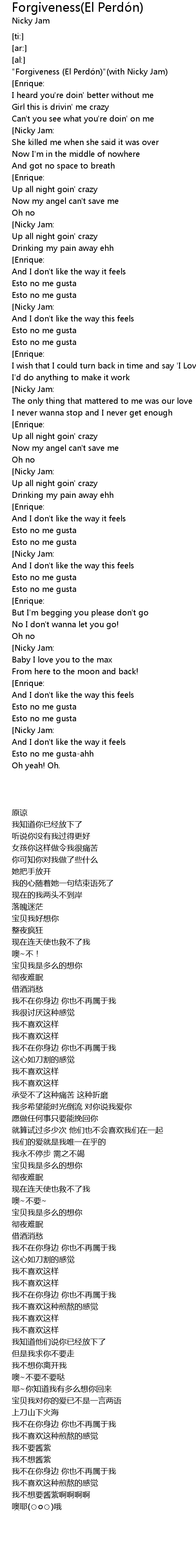 | [00:00.00] | " Forgiveness El Perdo n" with Nicky Jam |