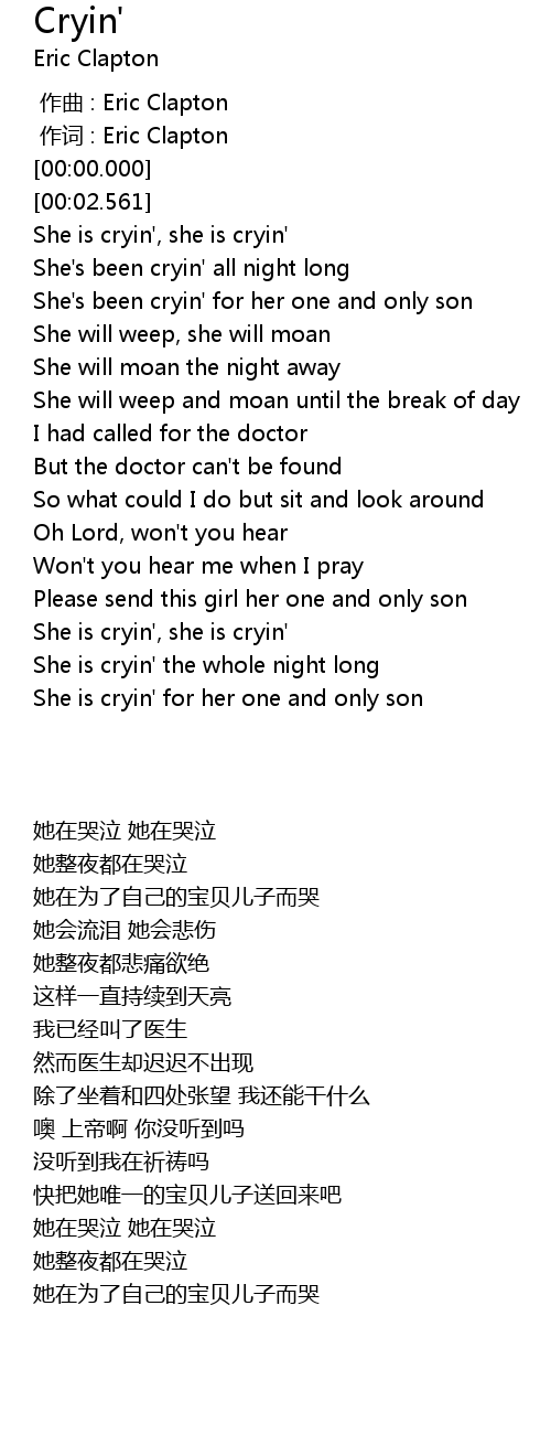 | [00:19.048] | She' s been cryin' for her one and only son |