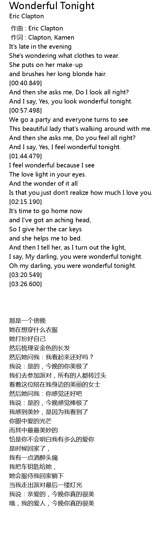 | [00:50.639] | And I say, Yes, you look wonderful tonight. |