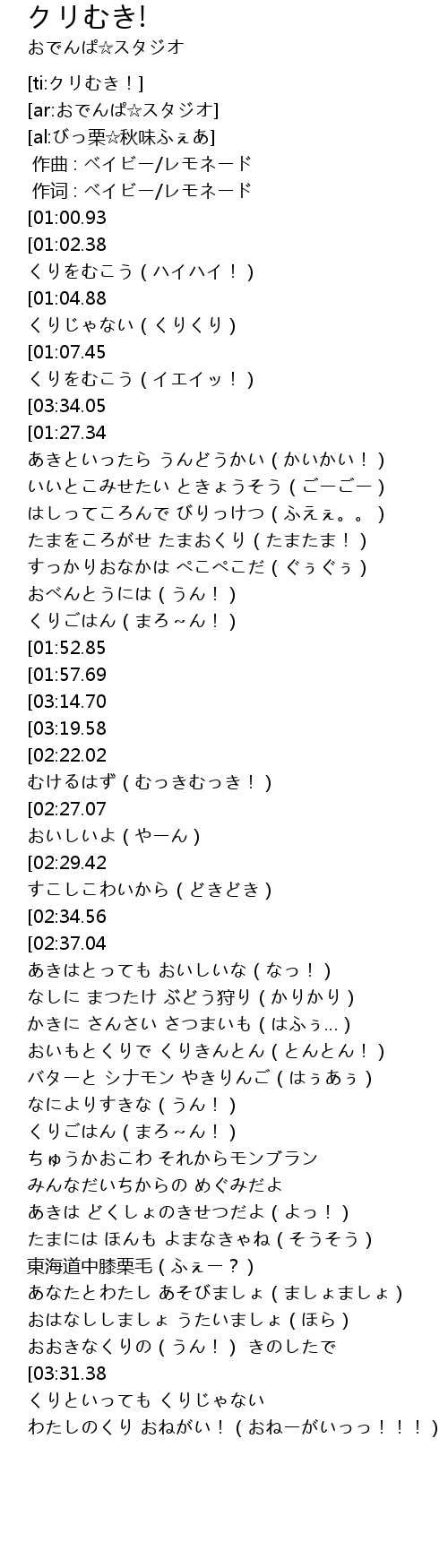 | [01:42.64] | おいもとくりで くりきんとん(とんとん!) |