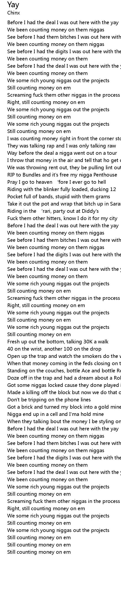 | [00:15.61] | See before I had them bitches I was out here with the yay |