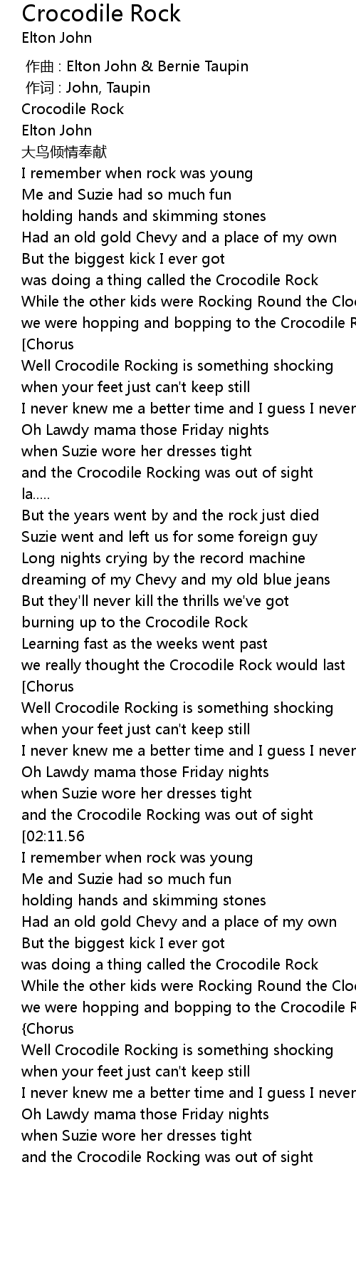 | [00:41.74] | Well Crocodile Rocking is something shocking |