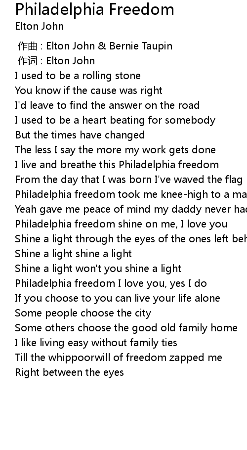 | [01:13.33] | Philadelphia freedom shine on me, I love you |