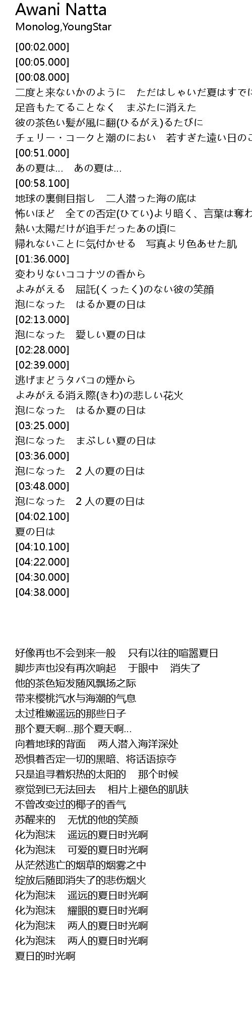 | [02:04.100] | 化为泡沫 遥远的夏日时光啊 |