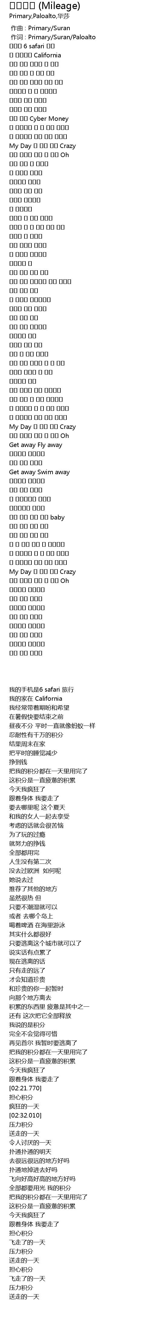 | [00:01.00] | 作词 : Primary/Suran/Paloalto |
