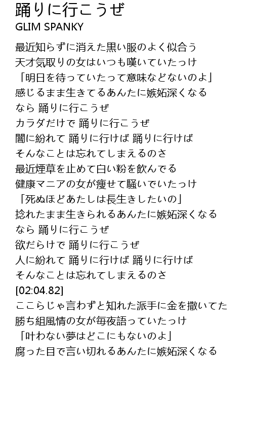 | [01:02.12] | 闇に紛れて 踊りに行けば 踊りに行けば |