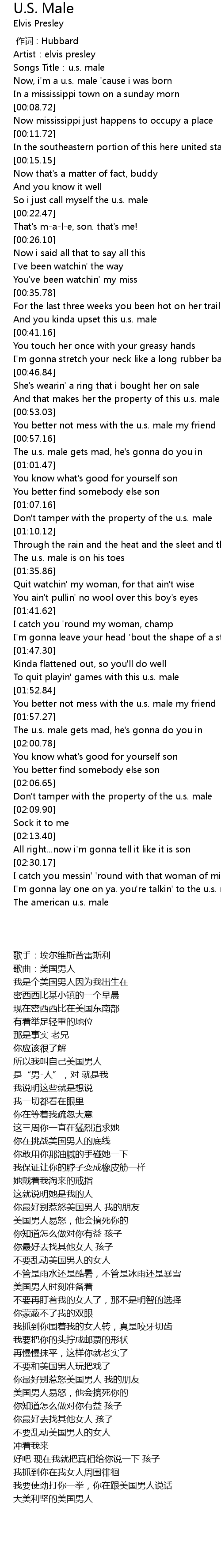 | [00:01.47] | Songs Title:u.s. male |
