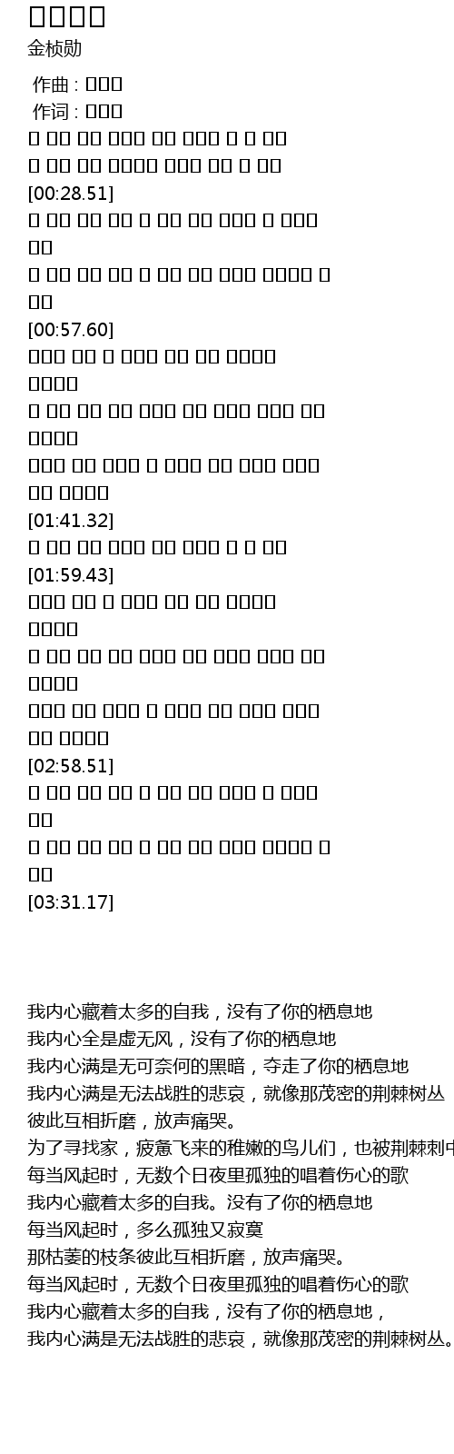 | [00:44.38] | 我内心满是无法战胜的悲哀,就像那茂密的荆棘树丛 |