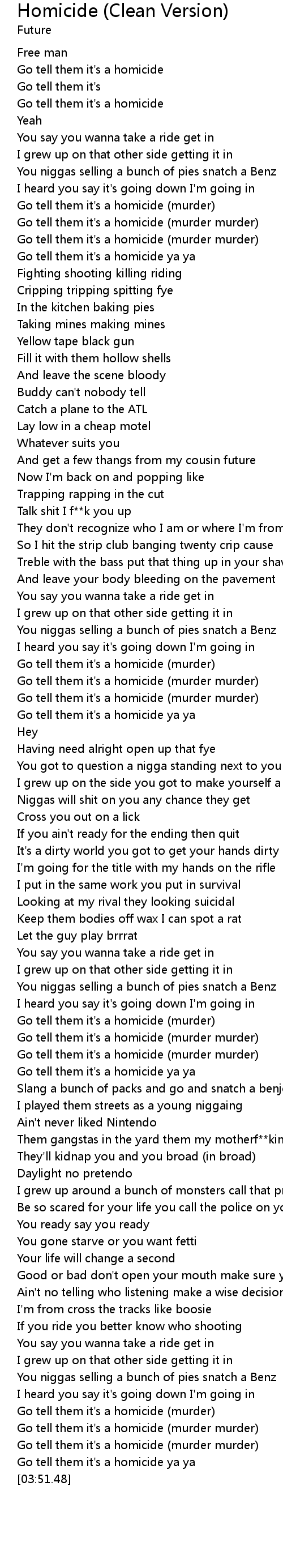 | [00:35.50] | Go tell them it's a homicide ya ya |