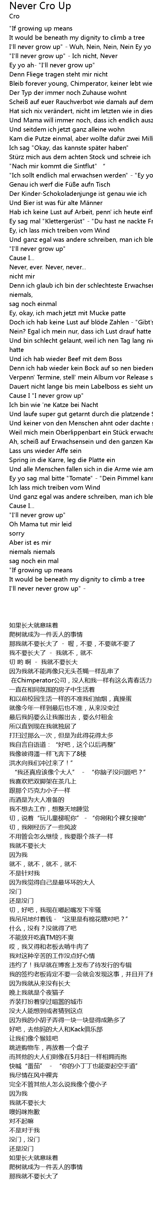 | [00:10.44] | I'll never grow up" - Wuh, Nein, Nein, Nein Ey yo |